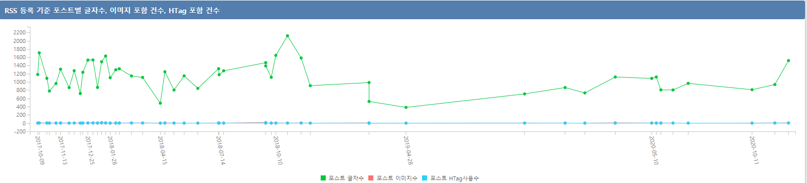 - RSS 등록 기준으로 포스트별 글자수, 이미지 포함 건수, H1, H2 와 같은 태그를 어느 정도 사용했는지