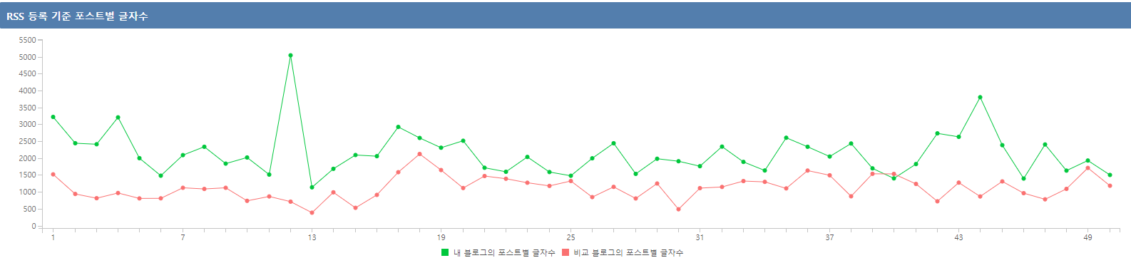분석도 간단하다. 내 블로그는 녹색, 비교하려는 블로그는 빨간색으로 표시된다.