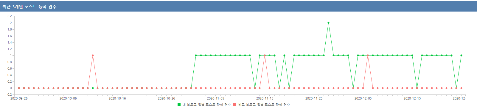 아래 결과를 보면 최근 3개월간 타블로그는 11월부터 꾸준히 1개씩 포스트를 작성한 것에 비해 내 블로그는 한 달에 1번 정도 포스트를 작성했음을 알 수 있다.