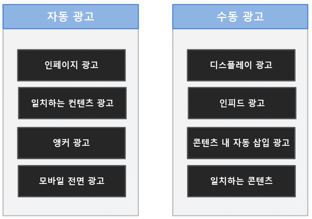자동 광고 또는 수동 광고 둘 중에 하나만 선택할 수 있는 것은 아니다. 둘 다 사용이 가능하지만, 임의로 위치를 수정 할 수 있는지에 따라 자동 광고와 수동 광고로 분류했다.