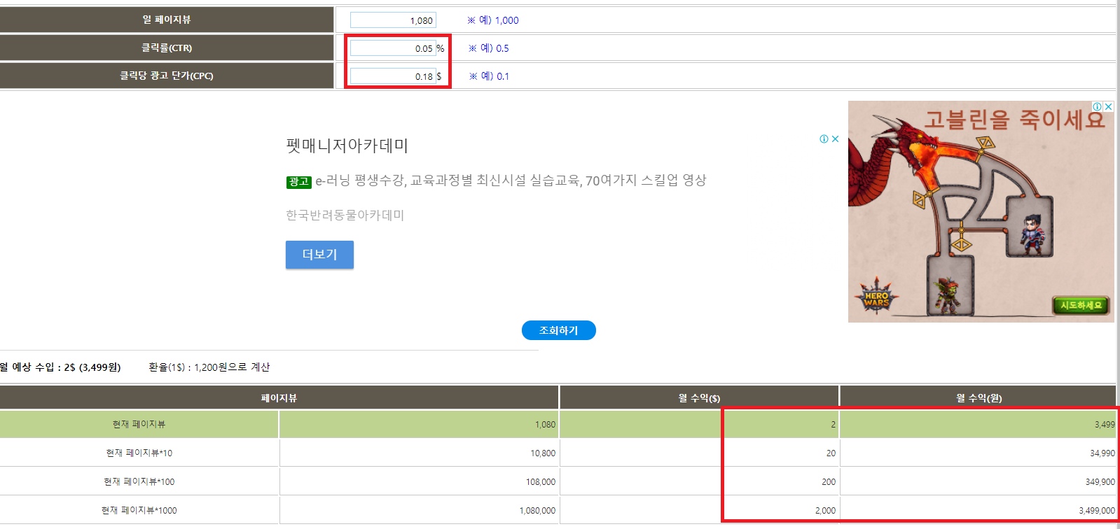 페이지뷰, 클릭률, 클릭당 광고 단가만 입력하면 환율이 고려된 예상 수익 확인이 가능하다.