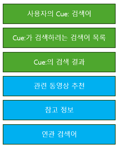 Cue:로 검색을 하면 Cue:는 검색 요청자의 의도를 분석하기 위하여 관련된 여러 개의 질의어를 생성하고, 해당 내용으로 검색을 진행하게 됩니다. 그리고 해당 질의어들의 결과를 합쳐서 Cue:의 검색 결과를 생성합니다.